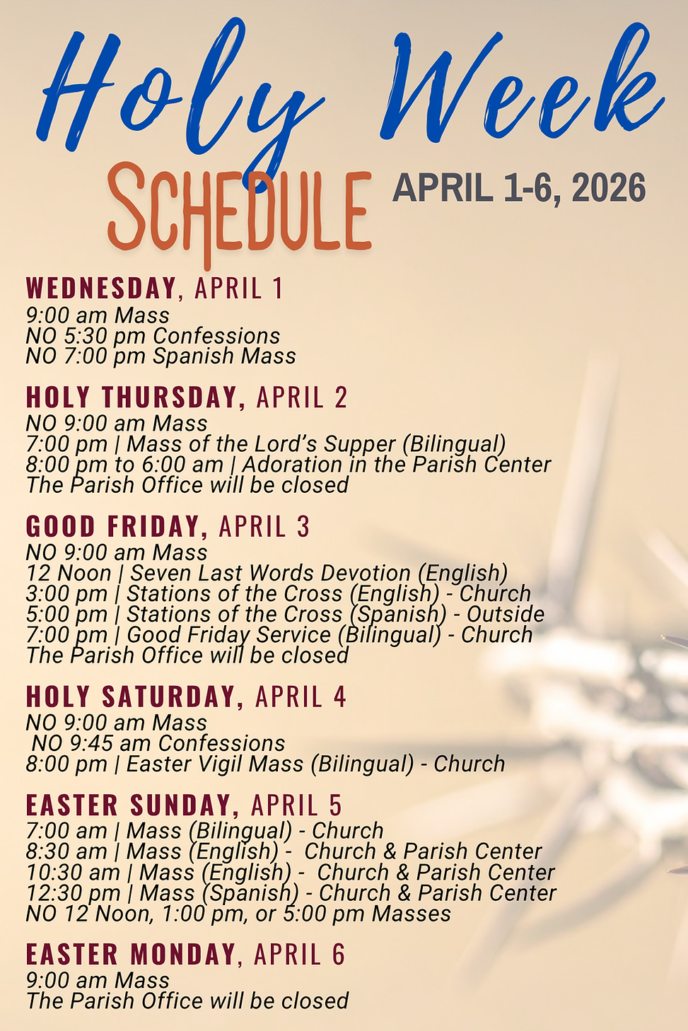for the Triduum and Easter Monday holiday.